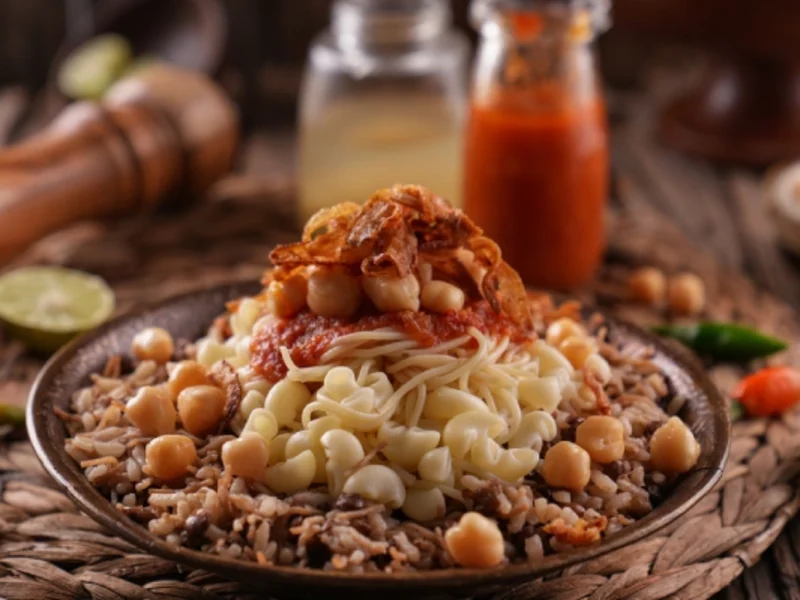 Le koshari incarne parfaitement l'ingéniosité culinaire égyptienne. Ce plat étonnant combine des ingrédients simples — riz, lentilles brunes et pâtes — surmontés de pois chiches, d'oignons frits croustillants et d'une sauce tomate épicée légèrement vinaigrée.