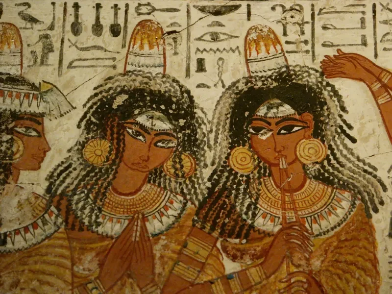 Les perruques occupaient une position centrale dans l'esthétique pharaonique. Confectionnées à partir de cheveux humains ou de fibres végétales soigneusement travaillées, elles remplissaient une double fonction : protection solaire et expression du rang social.