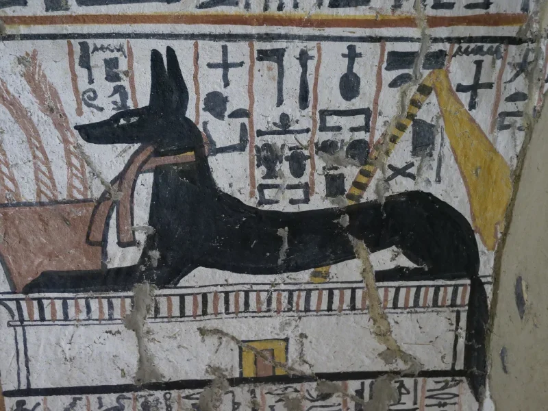 Anubis, représenté avec une tête de chacal ou comme un canidé noir, veillait sur les rites funéraires. Maître des nécropoles et protecteur des embaumeurs, il accompagnait les défunts lors du jugement d'Osiris.