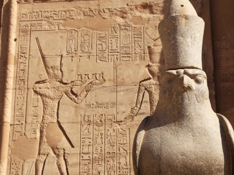 Horus, l'une des plus anciennes divinités égyptiennes, était représenté comme un homme à tête de faucon. Fils d'Osiris et d'Isis, il vengea son père en combattant son oncle Seth et devint le premier pharaon légendaire d'Égypte.