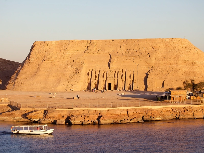 À 260 kilomètres au sud d'Assouan, les sanctuaires d'Abou Simbel imposent leur grandeur monumentale malgré l'éloignement géographique nécessitant trois heures et demie de route. Ramsès II ordonna l'édification de ces deux temples au XIIIe siècle avant notre ère : le grand sanctuaire, gardé par quatre colosses de vingt mètres représentant le souverain divinisé, et le temple plus modeste dédié à son épouse Néfertari ainsi qu'à la déesse Hathor.