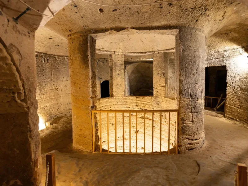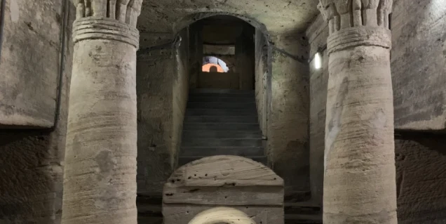 Les catacombes dévoilent leur splendeur aux visiteurs curieux depuis leur utilisation active entre le 2ème et le 4ème siècle. L'escalier circulaire, chef-d'œuvre d'ingénierie antique, permettait le transport solennel des défunts vers leur dernière demeure.
