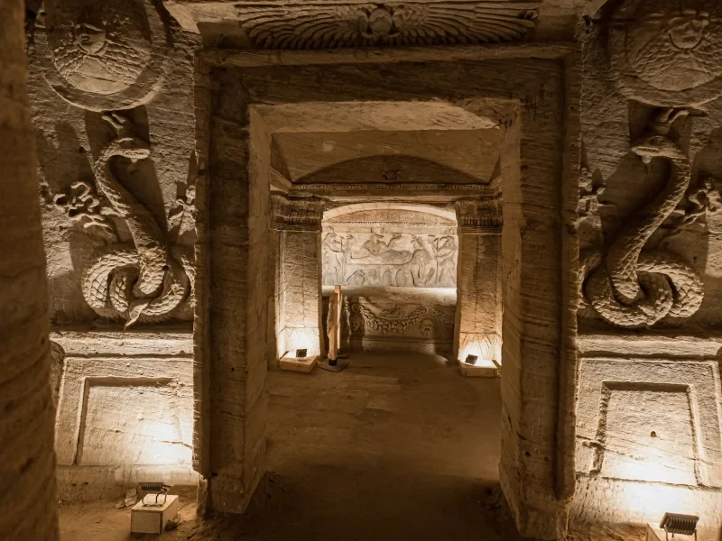 Alexandrie abrite ce joyau archéologique où convergent trois grandes traditions architecturales et artistiques. Les influences pharaoniques, hellénistiques et romaines s'entremêlent dans chaque recoin de cette structure creusée à 30,48 mètres dans la roche calcaire.