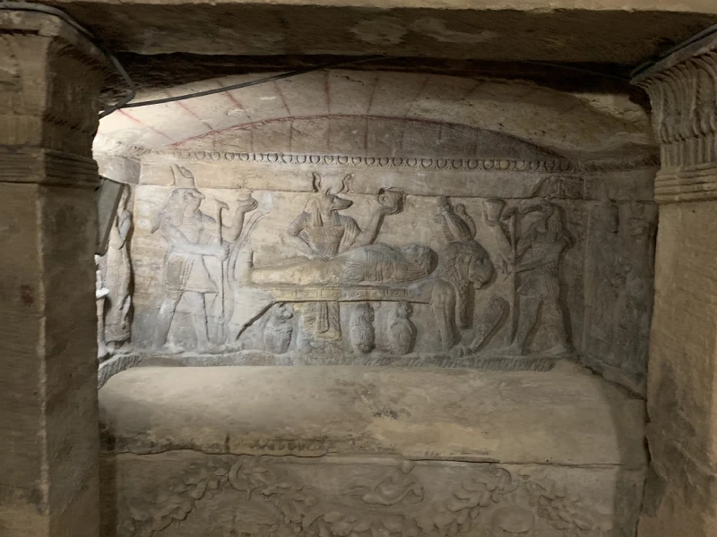 Les visiteurs observeront, sur les panneaux en relief entourant les sarcophages, la présence de trois vases canopes placés sous le lit funéraire. Ces réceptacles sacrés, normalement au nombre de quatre dans la tradition égyptienne pure, servaient à conserver les organes vitaux du défunt après l'embaumement.