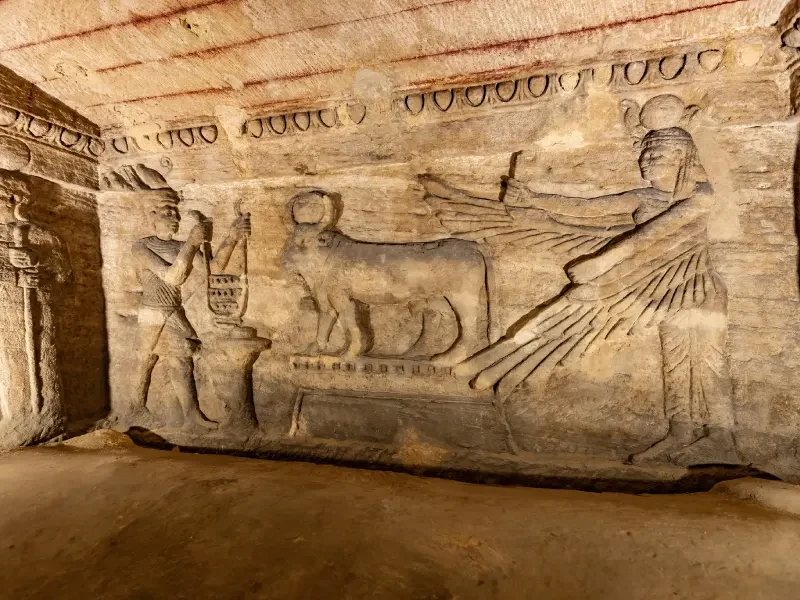 Le plafond voûté du triclinium démontre l'expertise technique des constructeurs. Les murs, ornés de niches et d'alcôves, recevaient jadis des lampes à huile créant une ambiance à la fois solennelle et mystique, propice au recueillement et à la communion entre vivants et défunts.