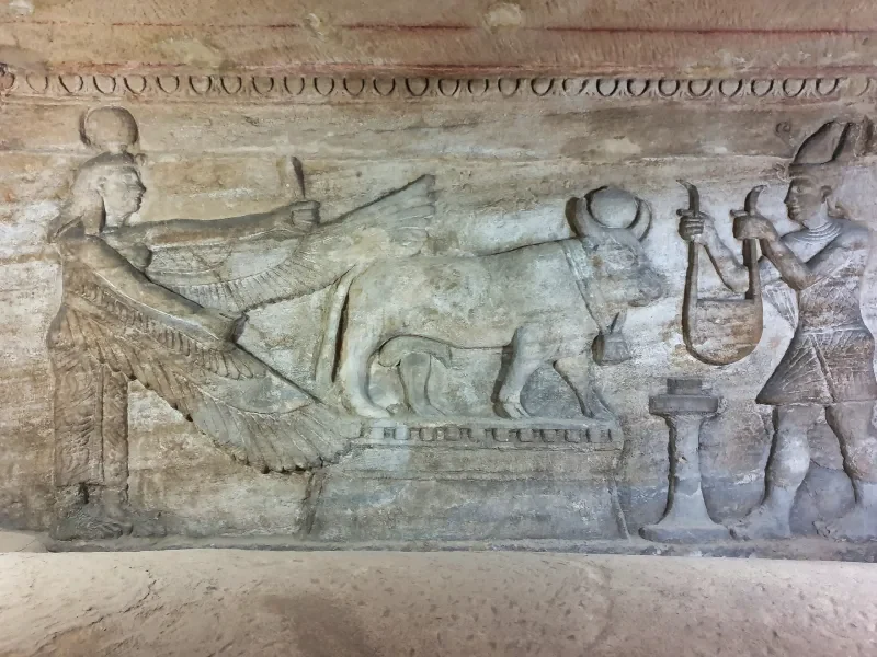 Apis, considéré comme l'incarnation vivante d'Osiris, recevait les honneurs durant sa vie puis était momifié après sa mort, suivant un deuil national de soixante-dix jours. Sa représentation dans les catacombes illustre éloquemment la persistance des croyances ancestrales égyptiennes, même sous l'influence culturelle gréco-romaine dominante.