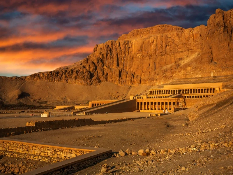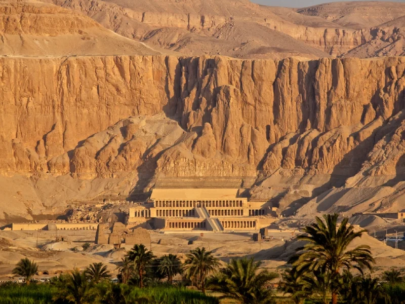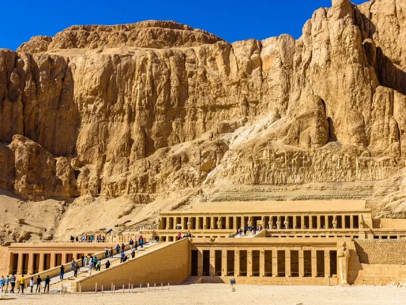 Son architecture en terrasses s'intègre harmonieusement dans le paysage naturel, offrant un témoignage remarquable du génie architectural égyptien antique.