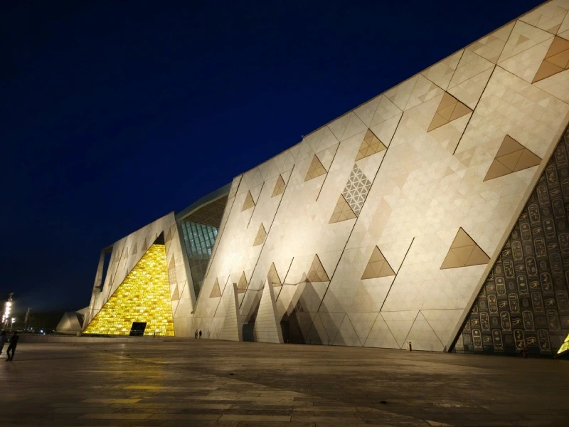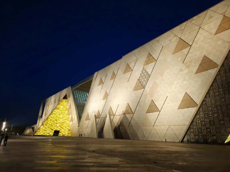 La place centrale du musée révèle cet alignement parfait, offrant une perspective ininterrompue sur les pyramides millénaires. Sa façade translucide de 27 000 mètres carrés capture les nuances du soleil désertique, métamorphosant l'apparence du bâtiment selon les heures et les saisons.