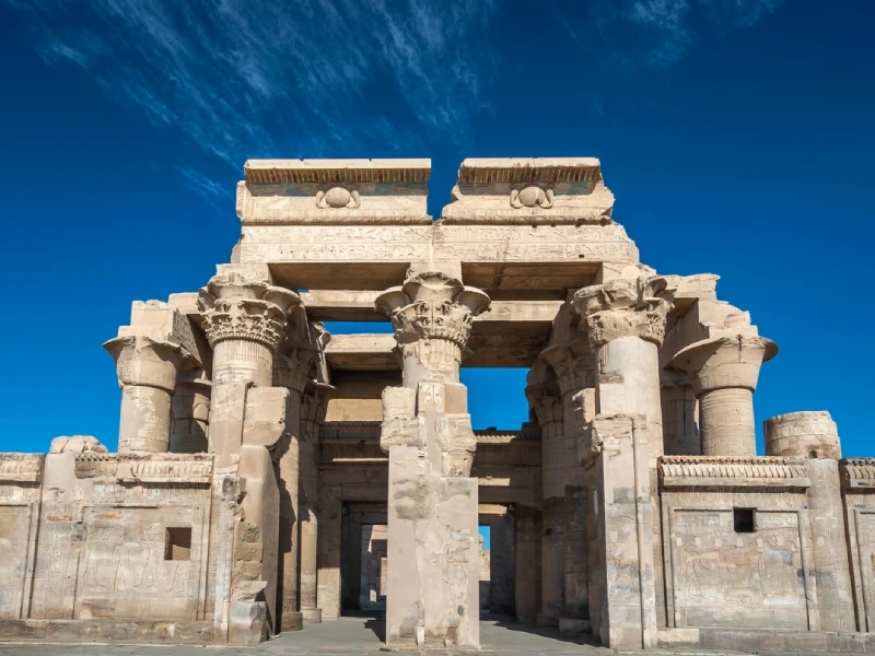 Ce qui rend le temple de Kom Ombo véritablement fascinant, c'est sa conception parfaitement symétrique le long de son axe principal. En effet, la partie sud était consacrée à Sobek, le dieu crocodile, tandis que la partie nord honorait Haroeris, le dieu à tête de faucon.
