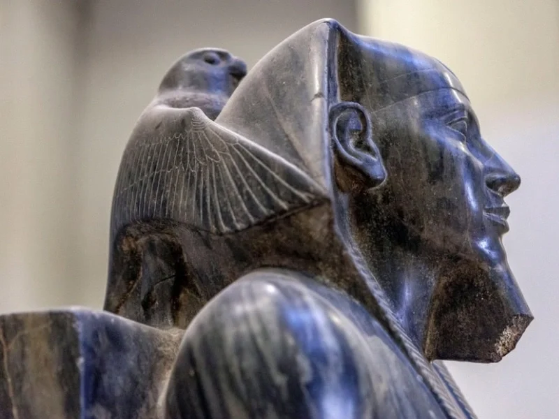 Le dieu Horus, représenté par un faucon, déploie ses ailes protectrices derrière la tête du souverain. Cette symbolique puissante rappelle la nature divine du pharaon.