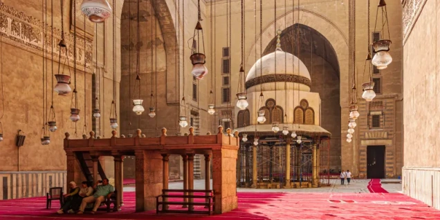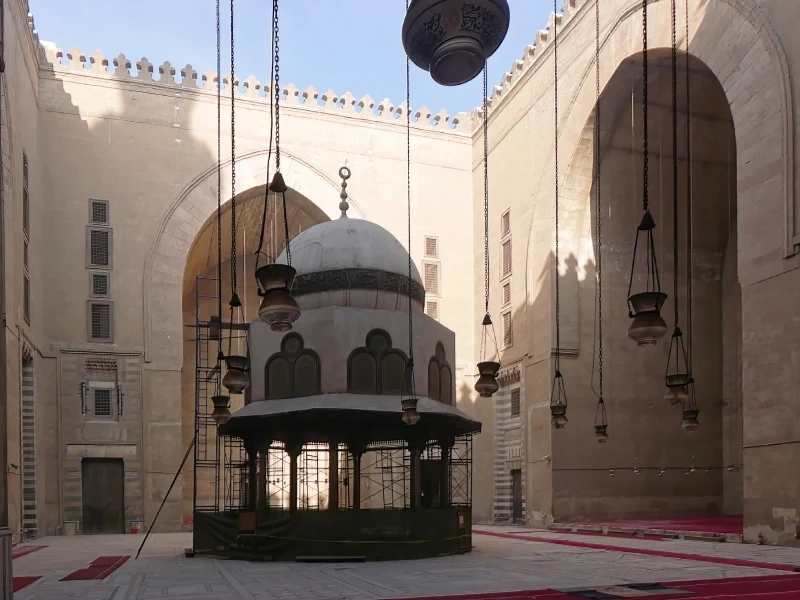 Ce chef-d'œuvre architectural abrite quatre madrasas, chacune dédiée à l'une des écoles de jurisprudence sunnite, et pouvait accueillir jusqu'à 500 étudiants dans ses logements. Fait fascinant, certaines pierres utilisées pour sa construction proviennent des pyramides de Gizeh, créant ainsi un lien tangible entre deux époques majeures de l'histoire égyptienne.
