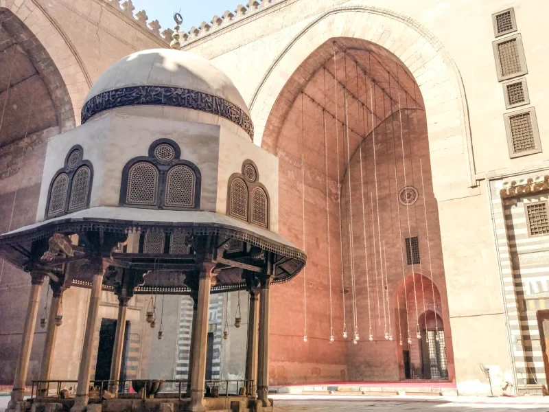 Au cœur de la Mosquée du sultan Hassan se dévoile un espace central d'une sérénité remarquable, offrant un véritable havre de paix à l'abri de l'agitation cairote. Cette cour intérieure, ou sahn, constitue l'élément organisateur de tout le complexe qui s'étend sur 7 900 m².