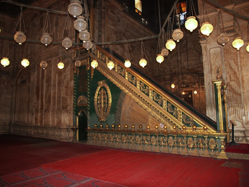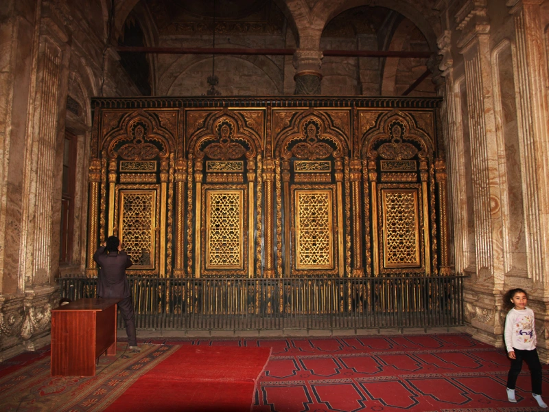 Particularité remarquable, deux minbars cohabitent dans cet espace sacré. Le premier, œuvre originelle en bois de cèdre sculpté et rehaussé d'éléments dorés, figure parmi les plus imposants d'Égypte.