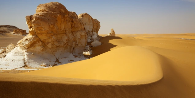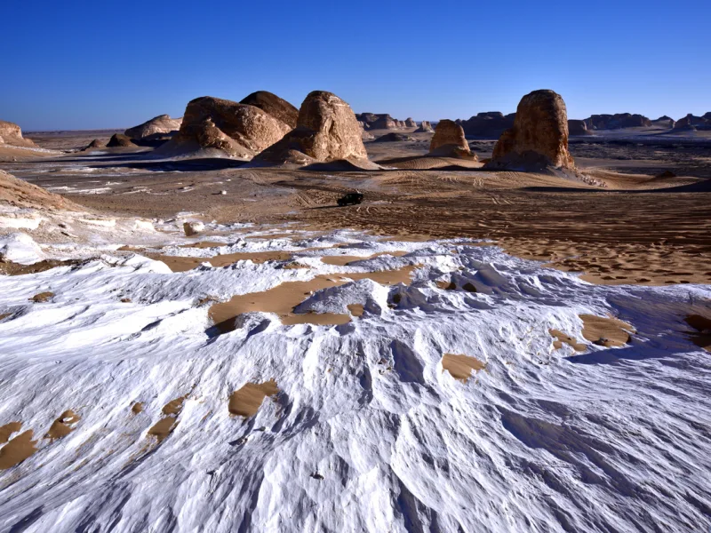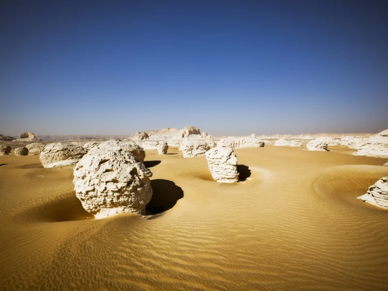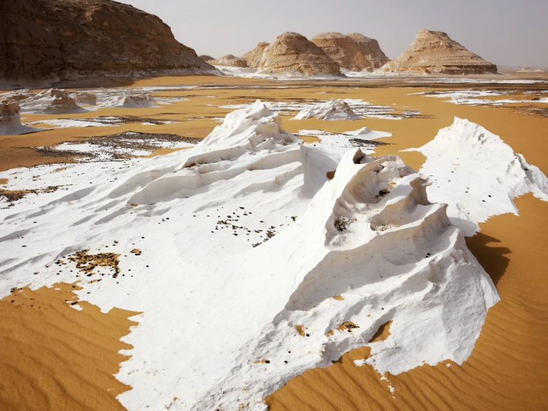 À environ 45 kilomètres au nord de l'oasis de Farafra s'étend le fascinant désert blanc, une zone protégée depuis 2002 couvrant plus de 300 km². Ce paysage surréaliste doit son nom à la blancheur immaculée de ses formations rocheuses en craie, sculptées par l'érosion au fil des millénaires.