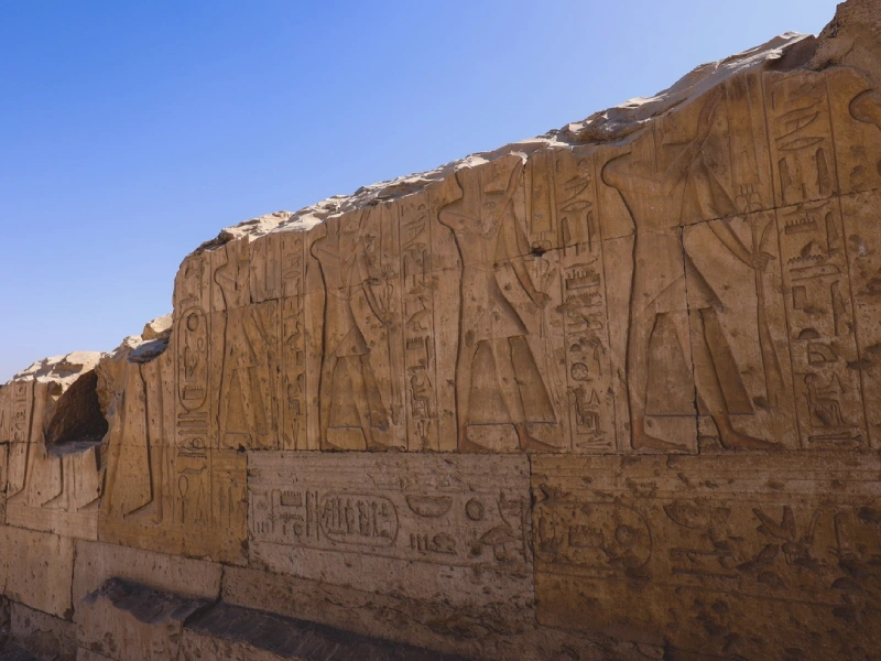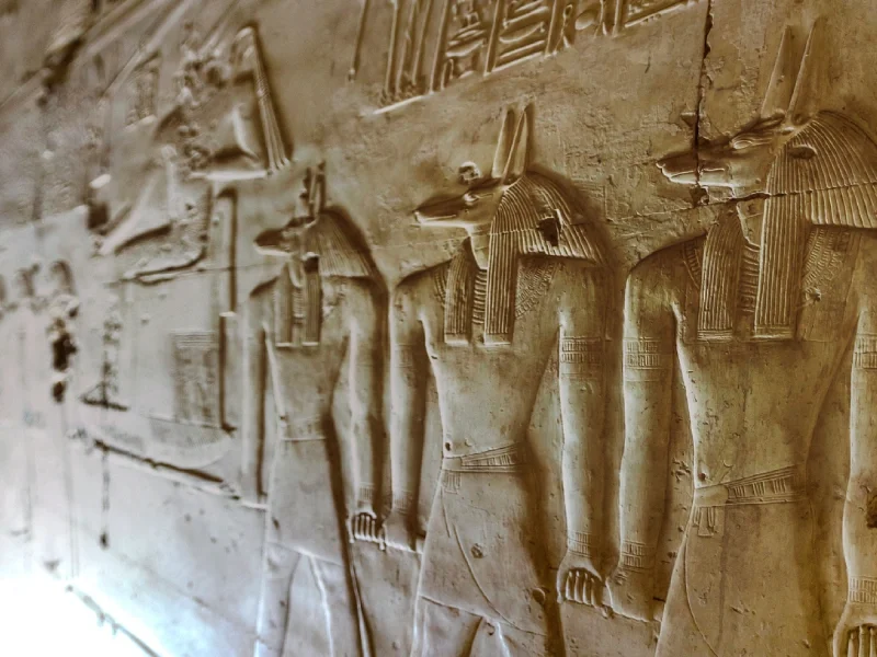 Les inscriptions et représentations murales de l'Osireion révèlent une richesse symbolique intimement liée à la mythologie égyptienne. Les hiéroglyphes minutieusement gravés ornent les murs et les colonnes, racontant des récits mythologiques et des chants liturgiques dédiés à Osiris. Ces éléments suivent des traditions rigoureuses pour illustrer des concepts religieux et divins, chaque symbole étant choisi avec soin pour refléter la spiritualité de l'époque.