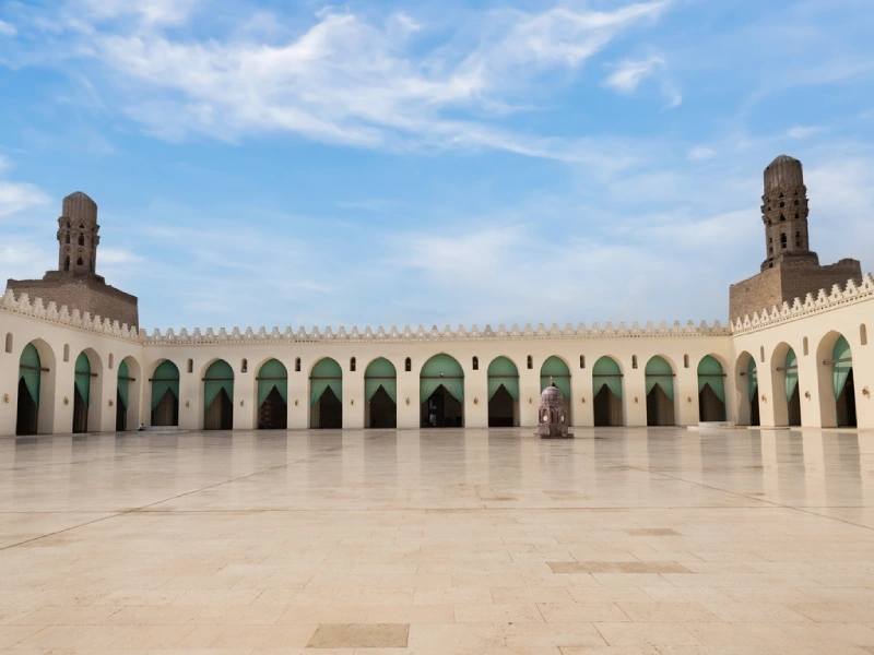 La mosquée Al-Hakim bi-Amr Allah s'impose dès l'extrémité nord de la rue Muizz. Sa construction débuta en 990 sous le calife al-Aziz bi-llah et s'acheva en 1013. Vous remarquerez immédiatement ses deux tours massives aux parois pyramidantes, surmontées de minarets caractéristiques. Son plan rectangulaire occupe environ 13 000 mètres carrés, avec une vaste cour centrale entourée de portiques sur quatre côtés.