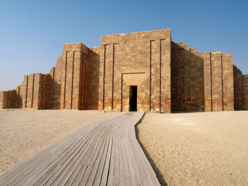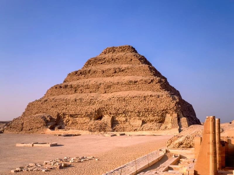 Construite vers 2650 avant notre ère par l'architecte Imhotep, elle représente le premier édifice entièrement bâti en pierre en Égypte et la première pyramide jamais construite. Haute de 60 mètres, elle marque une révolution architecturale en passant des mastabas plats aux structures pyramidales, préfigurant toutes les pyramides ultérieures dont celles de Gizeh.