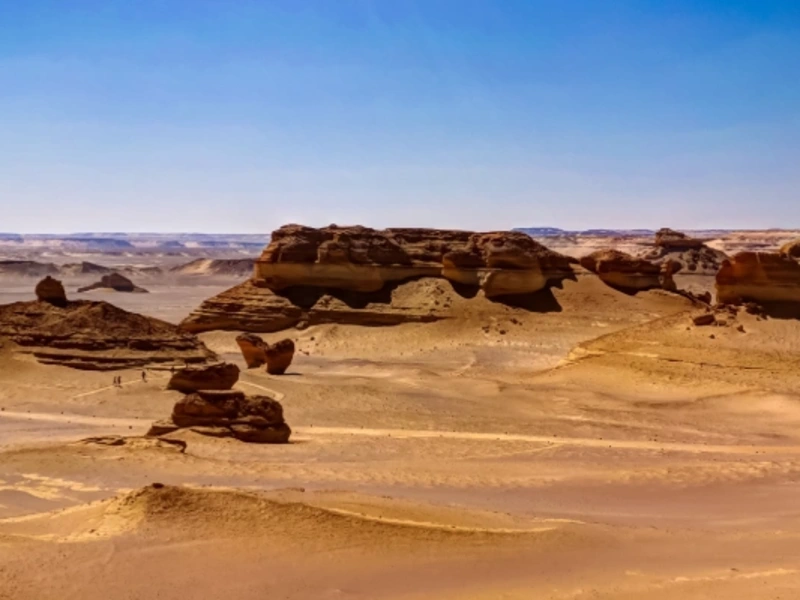Votre expérience à Wadi al Hitan constituera une rencontre exceptionnelle entre science, histoire et splendeur naturelle au cœur du désert égyptien. Les reliefs sculptés par l'érosion, les fossiles exposés et l'immensité du paysage aride composent un panorama saisissant, vestige d'un monde englouti depuis des millions d'années.