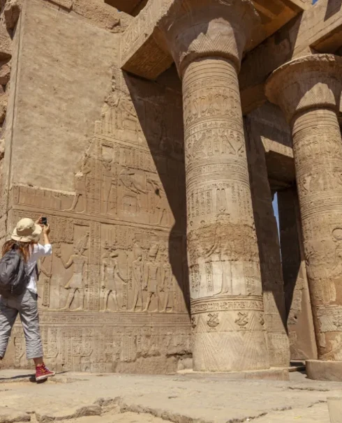 Visite en calèche du Temple d’Horus à Edfou, chef-d’œuvre d’harmonie. Puis découverte du temple double de Kom Ombo, dédié à Sobek et Horus. Deux énergies, un même lieu sacré.